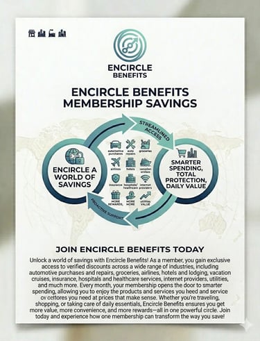 Unlock a world of savings with Encircle Benefits Membership! As a member, you gain exclusive access to verified discounts across a wide range of industries, including automotive purchases and repairs, groceries, airlines, hotels and lodging, vacation cruises, insurance, hospitals and healthcare services, internet providers, utilities, and much more. Every month, your membership opens the door to smarter spending, allowing you to enjoy the products and services you need at prices that make sense. Whether you’re traveling, shopping, or taking care of daily essentials, Encircle Benefits ensures you get more value, more convenience, and more rewards—all in one powerful circle. Join today and experience how one membership can transform the way you save!