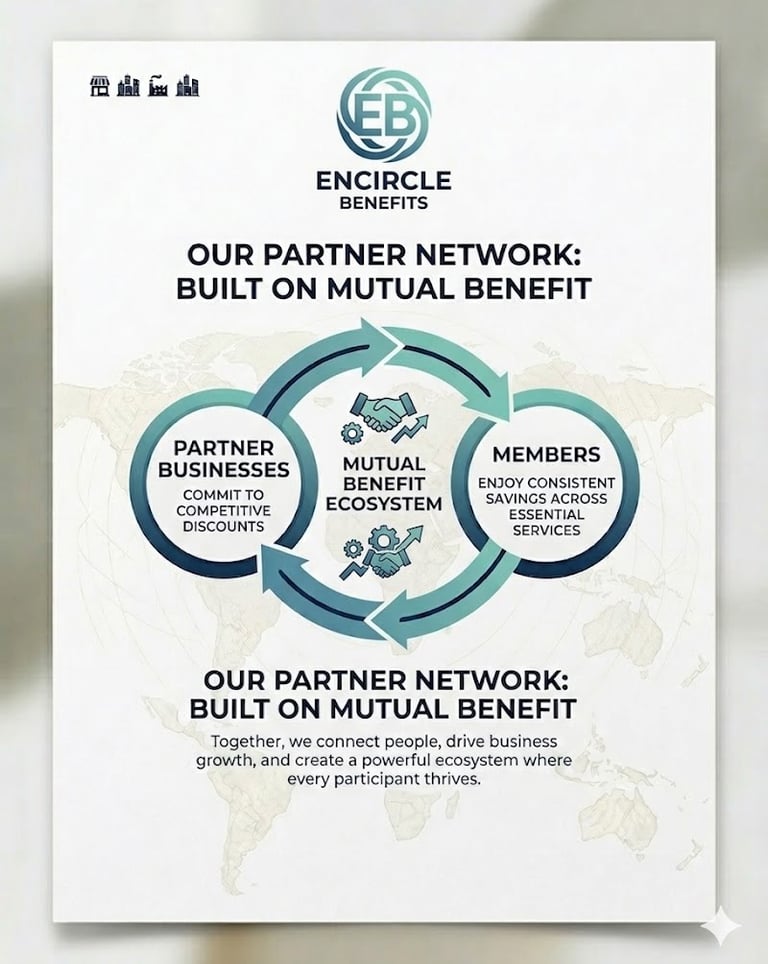 At Encircle Benefits, our Partner Network is the backbone of our platform. We collaborate with trusted businesses across multiple industries—including automotive, retail, travel, hospitality, healthcare, insurance, and utilities—to provide our members with exclusive discounts and value-added services. By joining our network, vendors gain access to a growing, engaged community of members, expand their brand reach, and increase customer loyalty through meaningful, long-term connections.